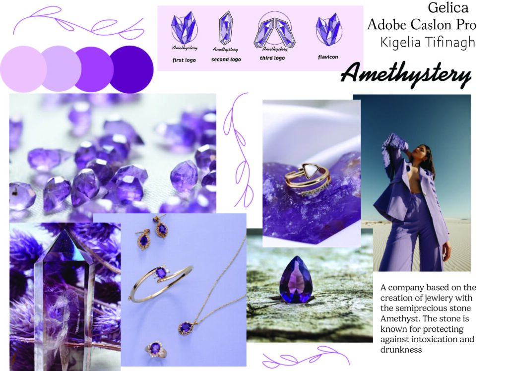 This moodboard captures the elegant and mystical essence of Amethystery through a palette of soft to deep purples inspired by the natural tones of amethyst. The combination of gemstone textures, jewelry photography, and refined logo sketches highlights the brand’s luxurious yet delicate identity. Overall, it conveys a sense of sophistication and modern femininity grounded in the stone’s symbolic protective qualities.