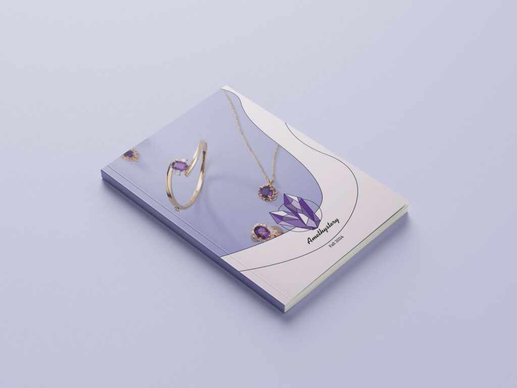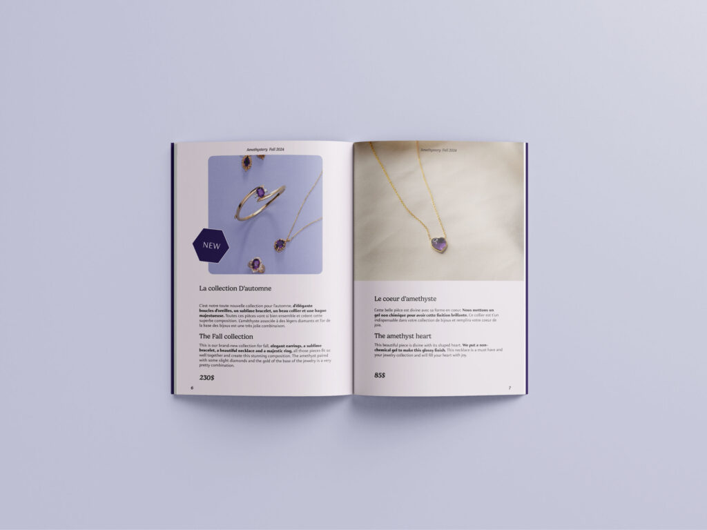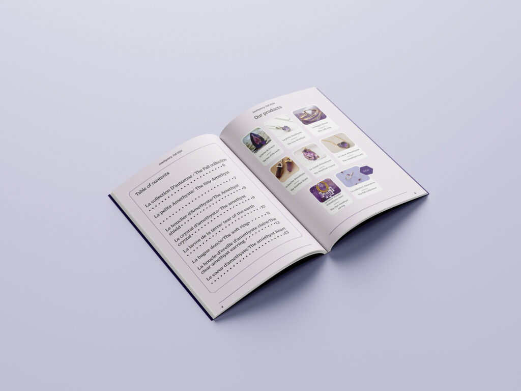 The cover combines product photography with clean, flowing illustration lines, echoing the organic shape and crystalline structure of amethyst. This blend of photography and illustration adds a modern, artistic touch while guiding the viewer’s eye toward the featured pieces. Inside, the layout follows a minimalist grid system, ensuring generous spacing, balanced margins, and an airy composition that elevates each item. High-quality product images are paired with bilingual descriptions, making the catalogue accessible while maintaining an upscale tone.