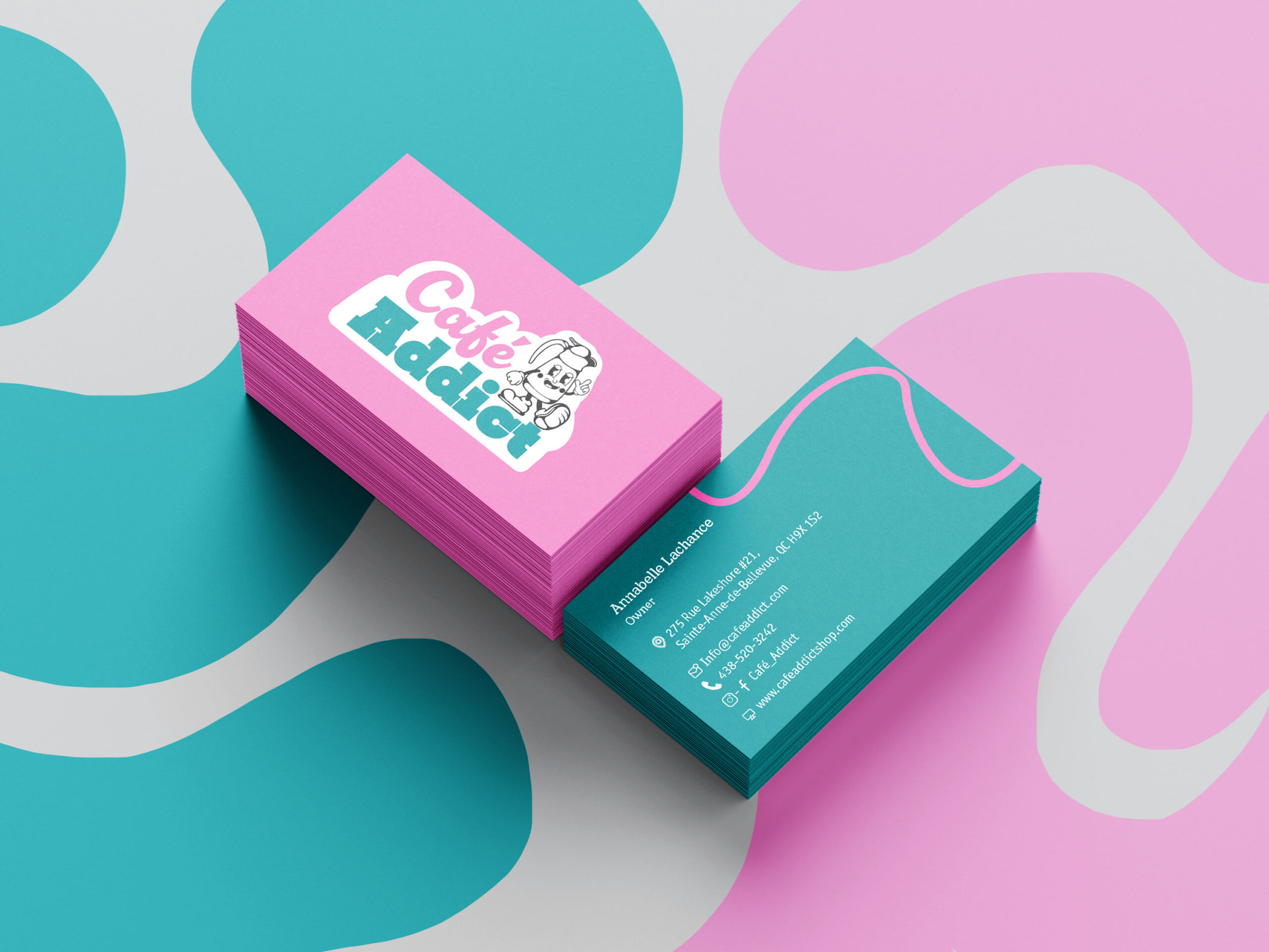 This branding project for Café Addict captures the nostalgic essence of a retro American diner while infusing it with a contemporary edge through its bold and unexpected color palette. The combination of bright pink and dark tealreinterprets the traditional red-and-turquoise diner aesthetic, bringing a sense of freshness and modern vibrancy to the visual identity. The logo design, inspired by the playful mascots of the 1950s, introduces Gisèle the Coffee Pot, a charming character that embodies the brand’s warm and approachable personality. Her presence anchors the visual system, establishing a sense of familiarity and continuity across all applications—from menus to packaging and signage. The checkerboard pattern pays homage to classic diner flooring, while the curved squiggly lines symbolize the aromatic steam rising from a hot cup of coffee, adding a dynamic, whimsical motion that balances the geometric structure. The overall design maintains the bold typographic hierarchy and clean alignment typical of mid-century diner menus, yet it’s updated through refined layouts, cohesive branding consistency, and playful illustration work. The contrast between the saturated hues and minimal white line art ensures legibility and visual impact, enhancing the brand’s nostalgic-meets-modern narrative. Altogether, Café Addict’s identity system successfully merges retro diner culturewith a modern graphic sensibility, creating a visually cohesive and memorable experience that feels both comforting and fresh—perfectly reflecting the café’s mission to blend tradition with innovation in both its design and customer experience.
