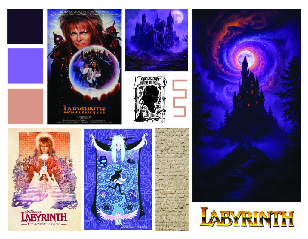 This Labyrinth moodboard captures the darkly enchanting and mystical atmosphere of the film through deep purples, muted neutrals, and fantastical imagery. The gothic castle, moonlit skies, and maze motifs evoke a sense of mystery and fantasy, while the textures and tones reflect the dreamlike yet eerie world of the story. The overall aesthetic blends fantasy and surrealism, emphasizing both wonder and tension within the labyrinth’s magical realm.