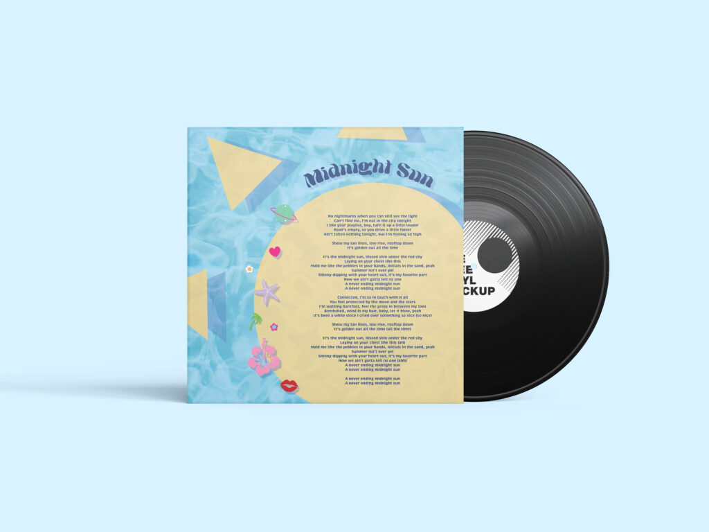 This vinyl album design for Midnight Sun by Zara Larsson captures the vibrant, carefree essence of her music and aesthetic through a nostalgic yet refreshing Y2K-inspired visual direction. The concept draws heavily from the artist’s energetic performances and colorful stage wardrobe, translating that sense of playfulness and summer euphoria into a cohesive, graphic representation of sound and mood. The design centers on a summery poolside theme, with the soft blue water texture serving as both a serene backdrop and a metaphor for fluidity, rhythm, and emotional depth—qualities that define the album’s tone.