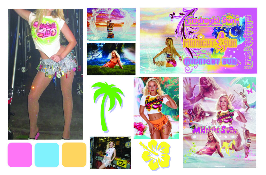 This moodboard for Midnight Sun captures a nostalgic early 2000s beach aesthetic, blending playful femininity with dreamy, tropical energy. The bright pastel colors, airbrushed graphics, and summer motifs like palm trees and hibiscus flowers evoke carefree youth and sun-soaked confidence. It reflects a balance between retro glam and modern fantasy, creating a vibrant, summery atmosphere full of personality and bold self-expression.