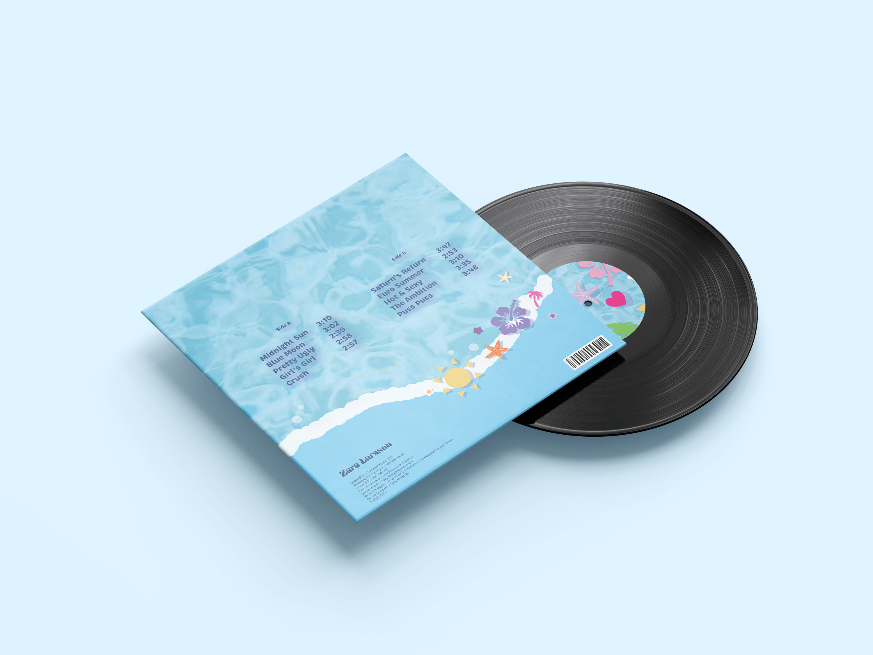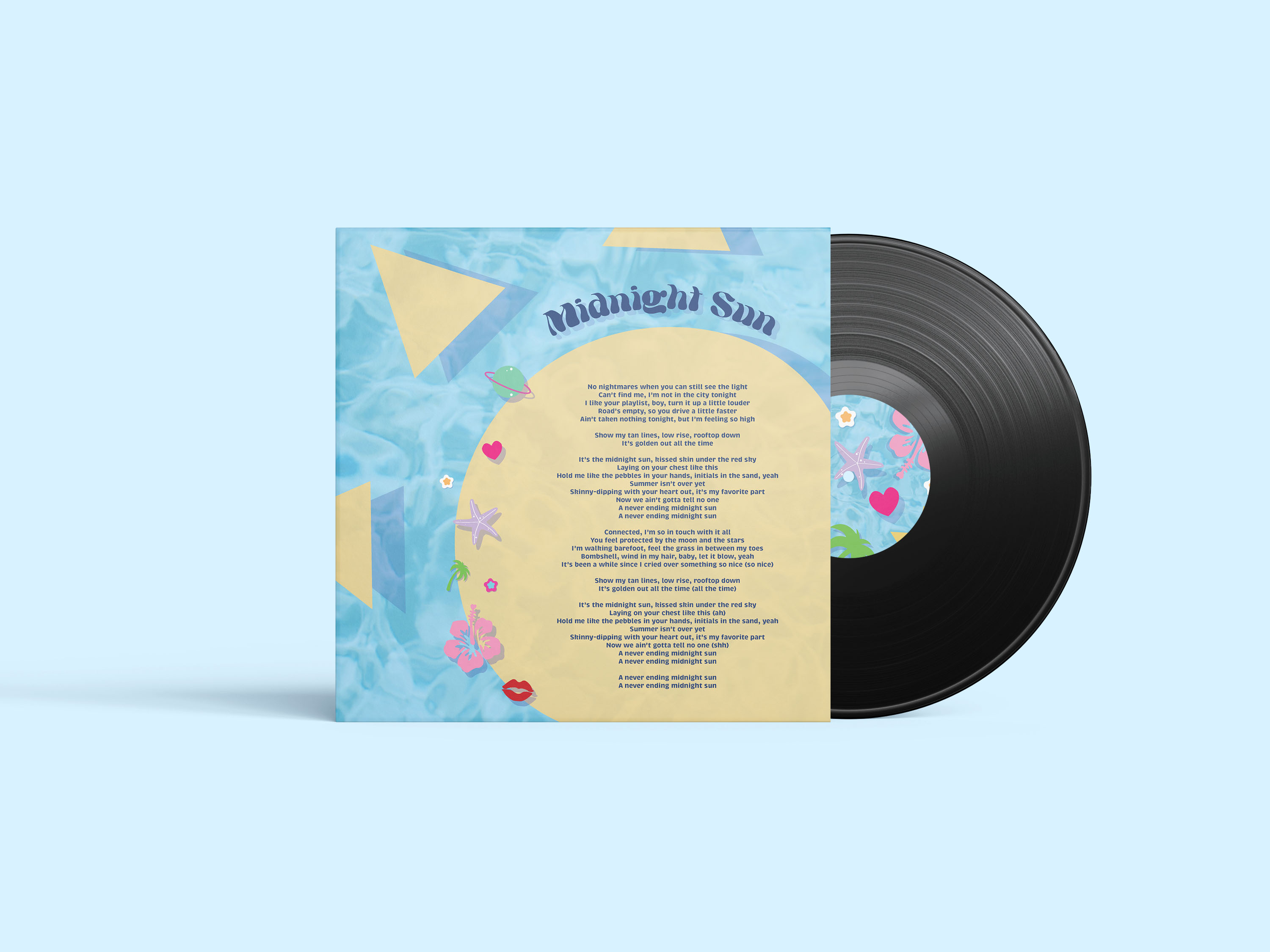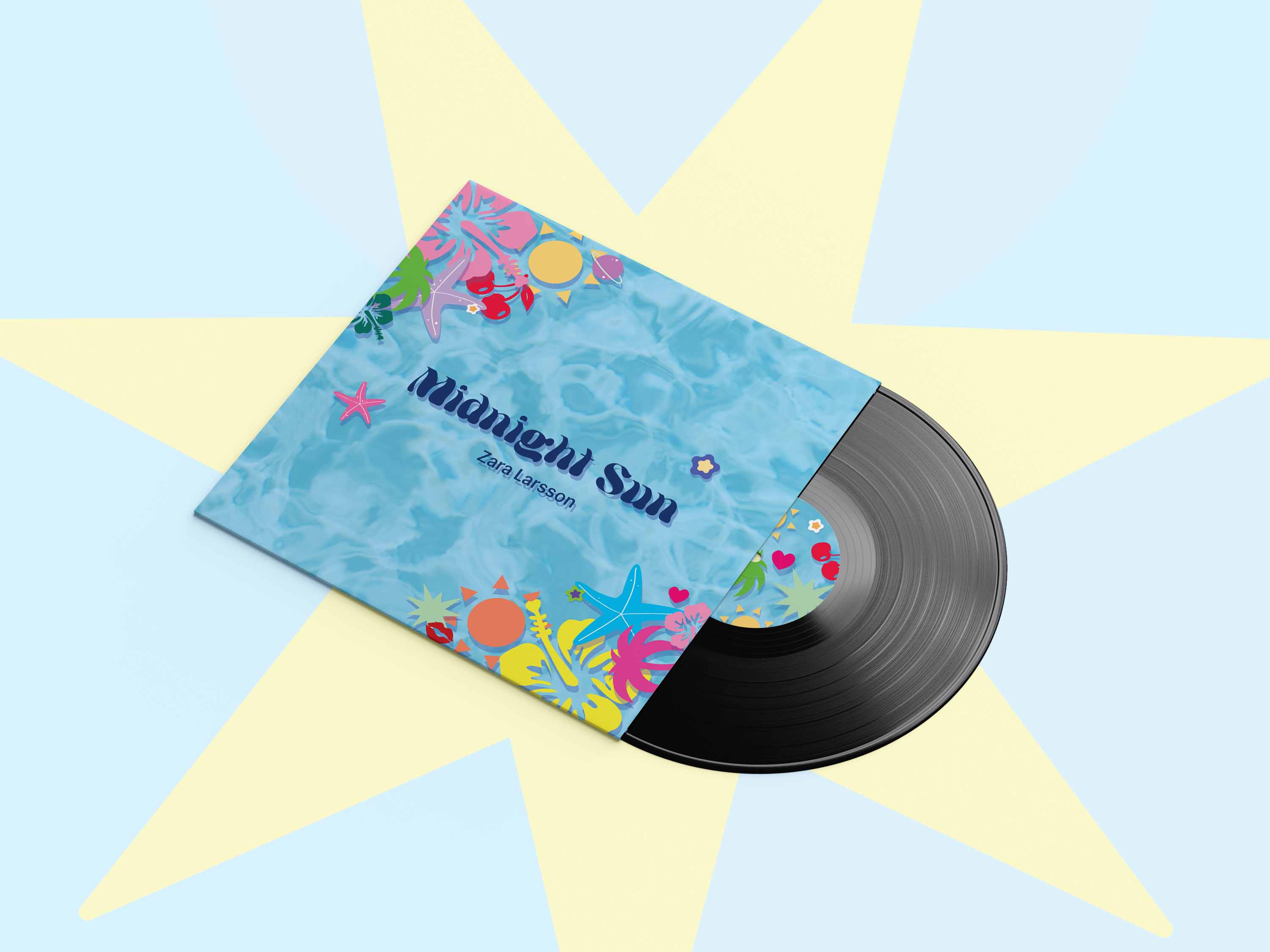 This vinyl album design for Midnight Sun by Zara Larsson captures the vibrant, carefree essence of her music and aesthetic through a nostalgic yet refreshing Y2K-inspired visual direction. The concept draws heavily from the artist’s energetic performances and colorful stage wardrobe, translating that sense of playfulness and summer euphoria into a cohesive, graphic representation of sound and mood. The design centers on a summery poolside theme, with the soft blue water texture serving as both a serene backdrop and a metaphor for fluidity, rhythm, and emotional depth—qualities that define the album’s tone.