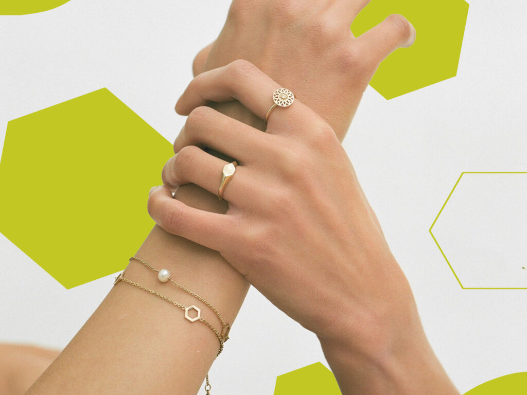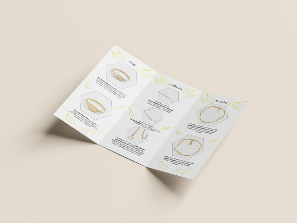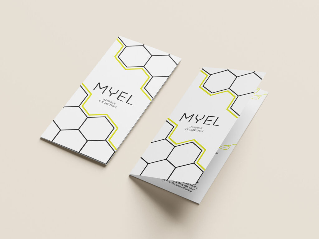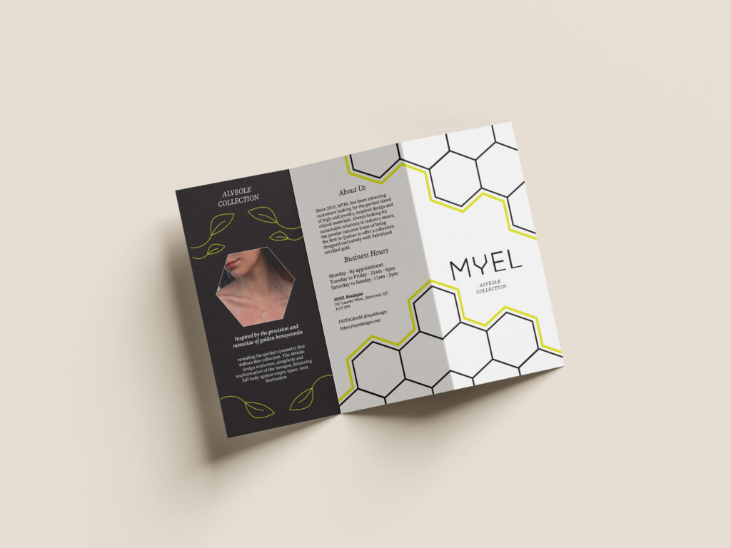 The visual strategy for the MYEL trifold brochure, specifically highlighting the Alveole collection, is rooted in a refined, minimalist aesthetic that mirrors the elegance of Montreal’s high-end jewelry scene. The design utilizes a sophisticated palette of stark white, deep charcoal black, and a vibrant lime-yellow accent. This specific choice of lime-yellow serves as a modern, energetic nod to the “Alveole” theme—referencing the natural vitality of honeycombs—while the heavy use of white space ensures the jewelry remains the primary focal point, adhering to the brand’s core principle of clean, understated luxury.