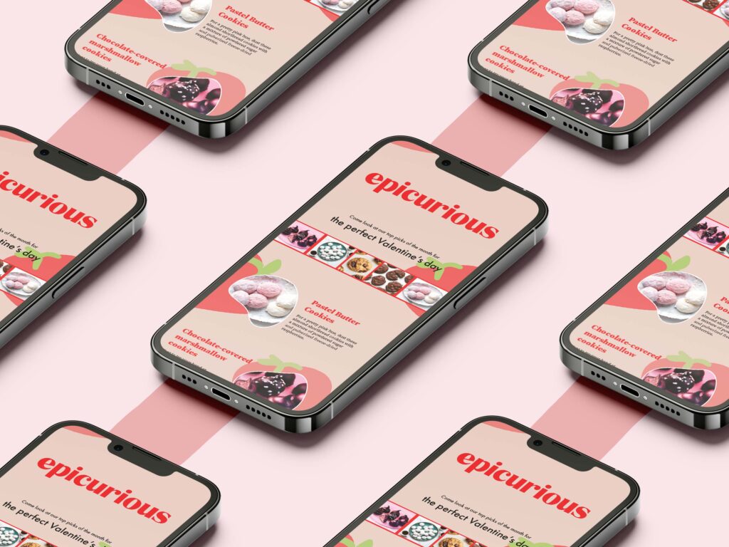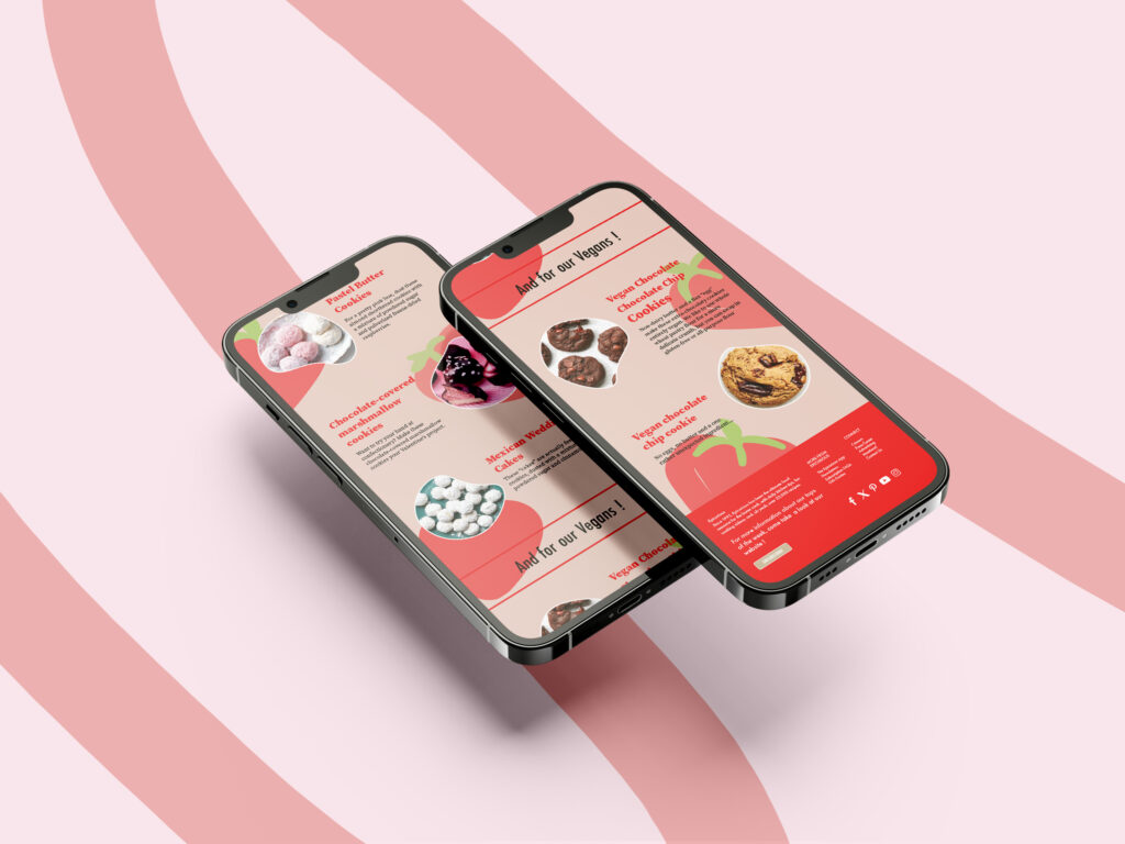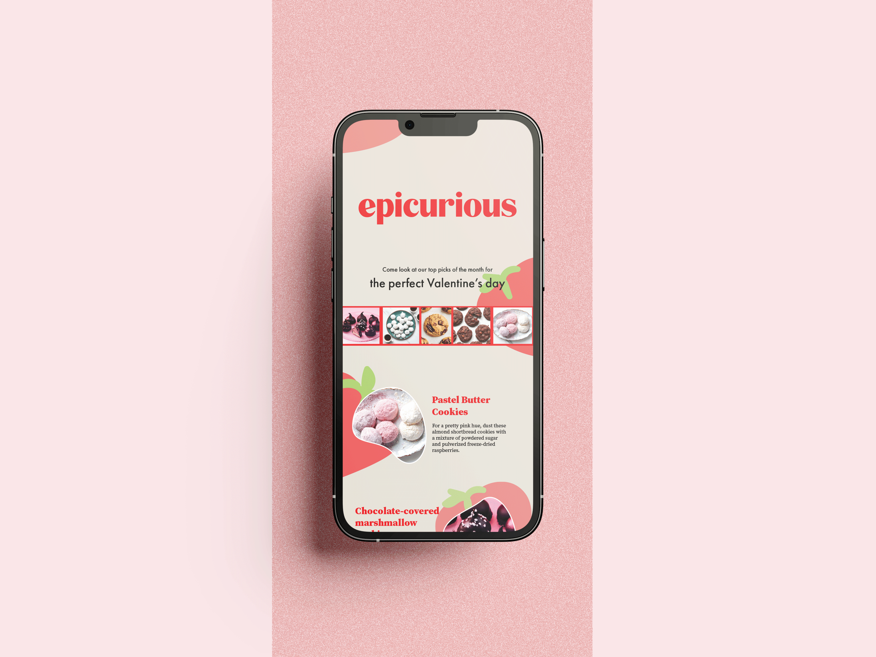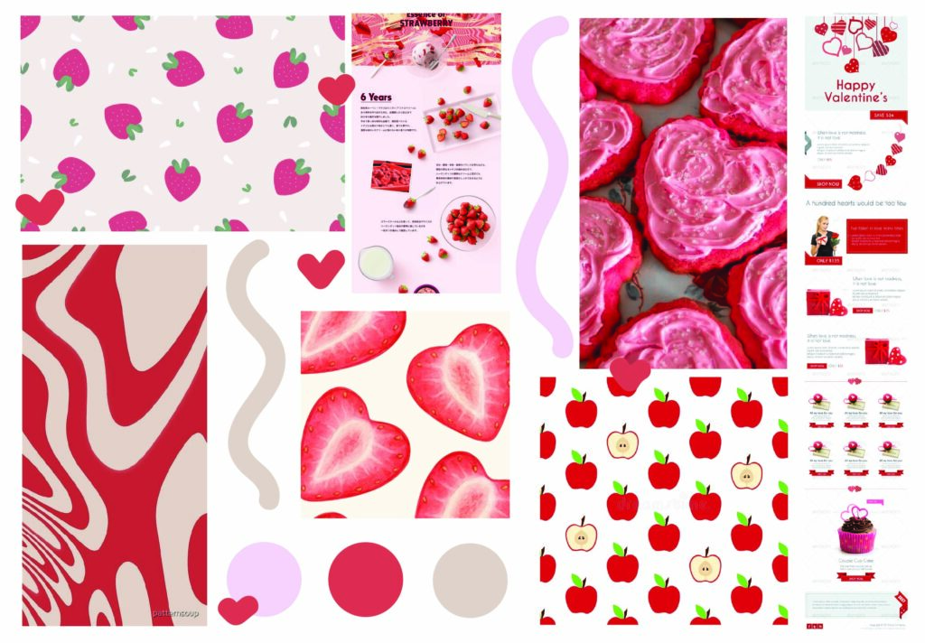 The color palette of soft pinks, warm reds, and creamy neutrals was carefully chosen to evoke Valentine’s Day while also referencing classic dessert tones such as strawberries, sugar, and chocolate. These colors create an atmosphere that feels romantic but also cozy and inviting. The flowing, abstract “gooey” shapes echo the textures of melted chocolate, icing, and dough, reinforcing the tactile, sensory nature of baking. The strawberry imagery in the background strengthens this association while tying the visuals directly to the Valentine’s theme.